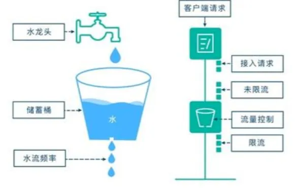 漏桶算法:漏桶算法思路很简单,我们把水比作是请求,漏桶比作是系统处理能力极限,水先进入到漏桶里,漏桶里的水按一定速率流出,当流出的速率小于流入的速率时,由于漏桶容量有限,后续进入的水直接溢出(拒绝请求),以此实现限流。